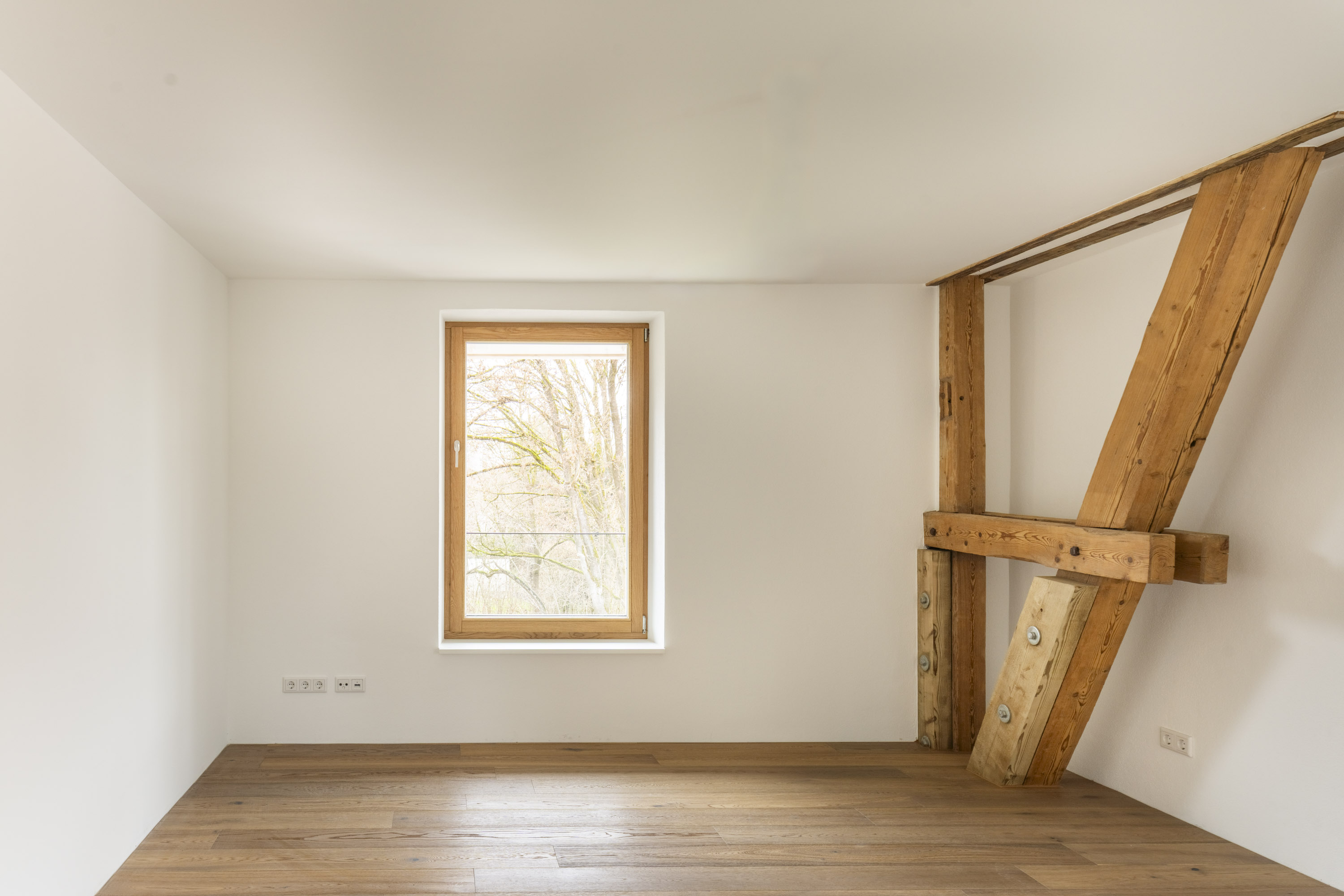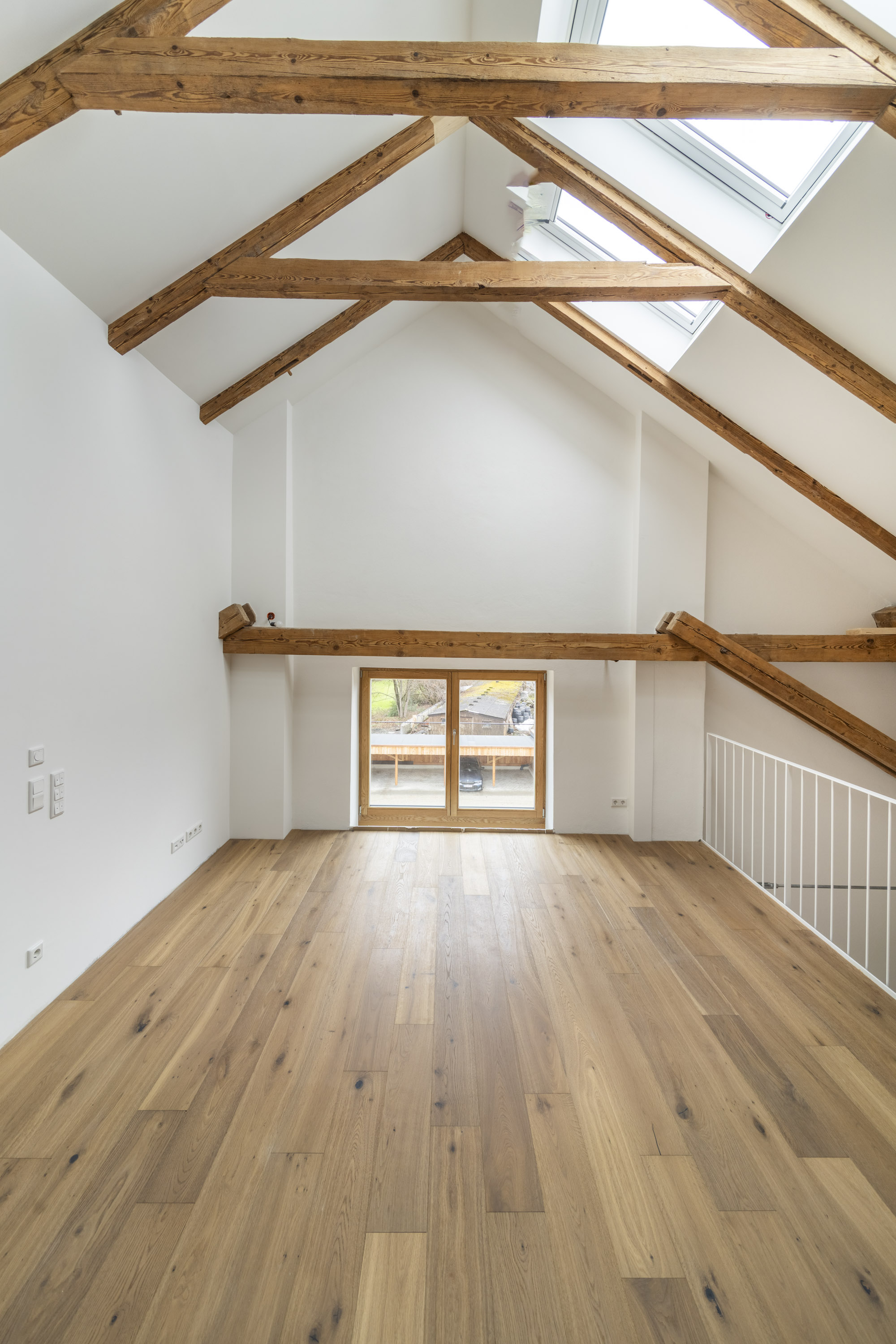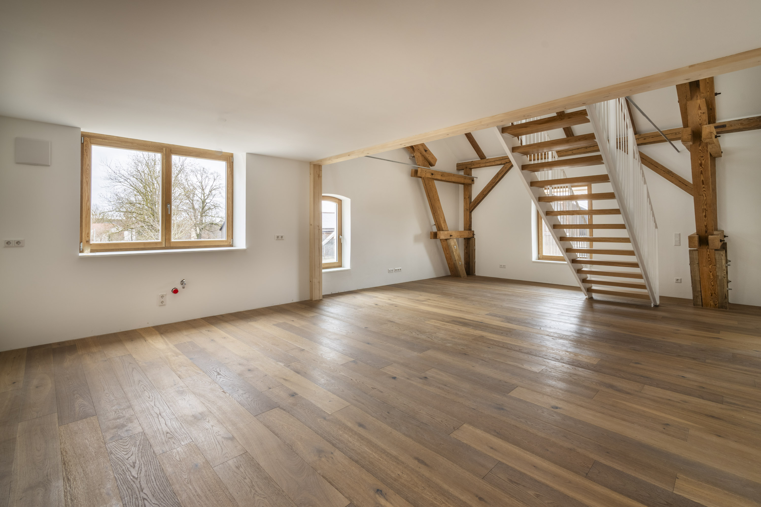 Auf einem historischen Gutshof gelegen, wurde diese charaktervolle Galeriewohnung soeben erstmalig bezugsfertig. Sie liegt im ersten Obergeschoss und ist über eine Treppe sowie die großzügige, helle ehemalige Tenne als gemeinschaftlichen Eingangsbereich für zwei Wohneinheiten erreichbar. Auf zwei Ebenen bietet die Wohnung ca. 137,7 m² Wohnfläche mit einem besonders großzügigen Raumgefühl, geprägt von Deckenhöhen bis zu ca. 6 Metern und dem freigelegten Schwarzkiefer-Dachstuhl aus dem Jahr 1895. Der Ausbau zeichnet sich durch nachhaltige Materialien und handwerkliche Details aus, darunter Eichenholzfenster in Schreinerarbeit, eine Stahltreppe eines Kunstschmiedes sowie hochwertiges Eichenholzparkett. Die Raumaufteilung folgt einem klaren, großzügigen Grundriss, der Offenheit und Rückzug harmonisch miteinander verbindet. Großzügige Fensterflächen sorgen in der gesamten Wohnung für eine helle, lichtdurchflutete Wohnatmosphäre. Der untere Wohnbereich beginnt mit der offenen Küche und einem weitläufigen Essbereich, die gemeinsam den Mittelpunkt des täglichen Wohnens bilden. Angrenzend dazu befindet sich ein ruhig gelegenes Schlafzimmer mit morgendlichem Sonnenlicht. Abgerundet wird dieser Bereich durch ein separates Gäste-WC sowie ein daran anschließendes Badezimmer mit bodentiefer Dusche und Waschmaschinenanschluss. Ein weiteres, flexibel nutzbares Arbeits- oder Kinderzimmer rundet diesen Wohnbereich ab. Über die interne Treppe führt der Weg zur Galerie, die sich ideal als großzügiger Wohnbereich nutzen lässt. Die beeindruckende Raumhöhe und das offene Design verleihen diesem Ensemble eine besondere Weite. Direkt daneben befinden sich ein weiteres behagliches Schlafzimmer sowie ein zusätzlicher Raum, der sich ideal als Ankleidezimmer nutzen lässt. Für zeitgemäßen Wohnkomfort sorgt eine Grundwasser-Wärmepumpe mit Fußbodenheizung. Der Wohnung sind ein Gartenbereich, ein Abstellraum im direkt angrenzenden Nebengebäude sowie ein Carport-Stellplatz und ein Außenstellplatz zugeordnet. Ein Zuhause für Menschen, die Architektur, Geschichte und großzügiges Wohnen in besonderer Umgebung zu schätzen wissen.